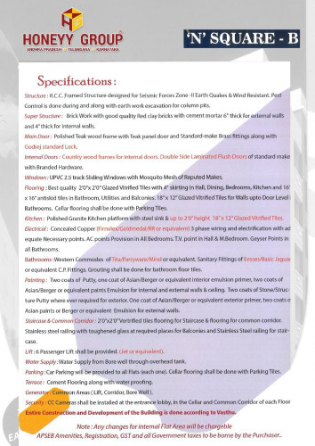 **N Square - B** is an exclusive residential project located in Gajuwaka, offering a perfect blend of privacy and modern living. Designed as a G+4 apartment with only 5 flats in total, the project ensures a low-density and peaceful environment. It features well-planned 3BHK homes with 1200 sq. ft., ideal for comfortable family living. With East and West facing options, the apartments provide good ventilation and natural light. Built with quality construction and essential amenities, this under-construction project is a great opportunity for homebuyers seeking a well-connected location with future growth potential.