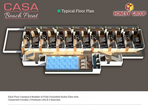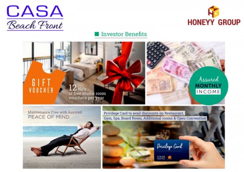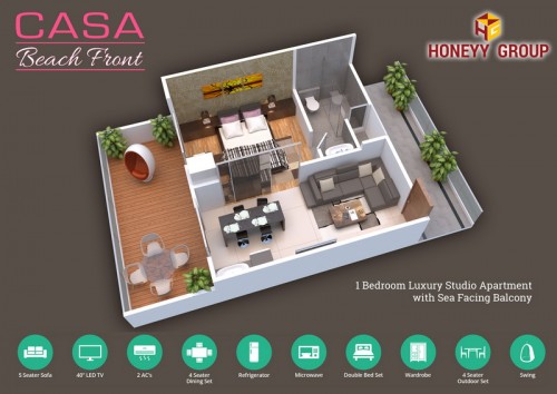 Casa Beach Front’ is one bedroom fully furnished studio apartment with sea view. This is kind of a holiday home which generates monthly fixed revenue to the owners with yearly free complementary night stay vouchers to spend with family & friends. This project has total 40 number of studio units covering 5 floors. This project will be built in the size of 1778 Sqyds situated on the hill top with sea facing. Each Studio is built to the size of 770 Sqft (With 560 Sqft carpet area) coverin
