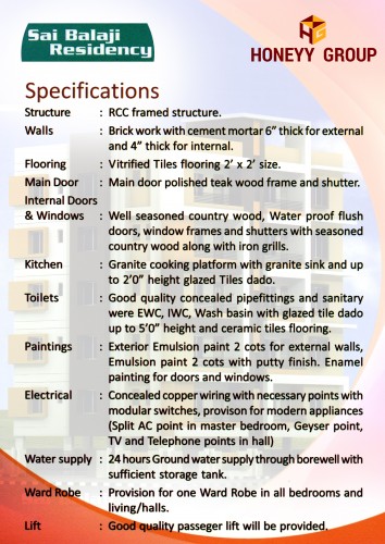 Newly constructed as per vastu specifications. Ceramic tiles, Putty finished walls with plastic emulsion, Teak wood entrance door, Sal wood doors and window frames, Kitchen with black granite platform, Well ventilated, One lift with generator back up, Basement car perking.