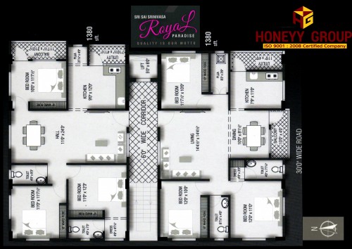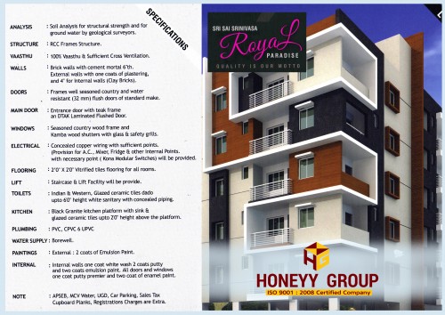 Sri Sai Srinivasa Roryal Paradise is 3 bedrooms flat with an adjoining hall. This unfurnished flat has a covered area of 1380 SFT and has 3 bathrooms. Additionally, there are puja room. The flat has vitrified flooring. It overlooks garden, main road and faces North, South direction. The booking amount 10% .